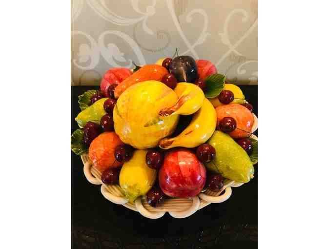 16" x 9.25". This incomparable Porcelain Basket is filled with detailed porcelain fruit with life-life features. The piece was purchased by the collector in Chile in 1995. Artist unknown, but all indications of style, quality and pattern of Italian origin.