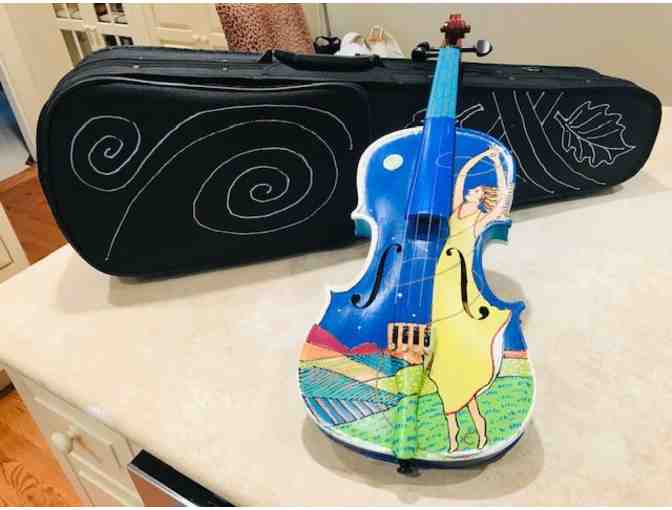 14" x 23". This hand-painted violin has exquisite detail on every curve. This piece comes with an embroidered violin case.