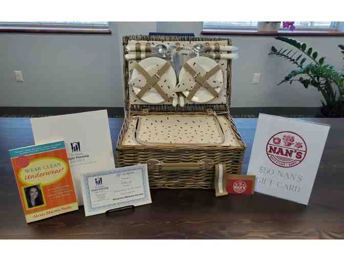 Package also includes a a copy of the best-selling estate planning book, "Wear Clean Underwear, A Fast, Fun, Friendly--And Essential--Guide to Legal Planning for Busy Parents", the exclusive "Kids Protection Planning Guide", a lovely picnic basket that contains all the essentials for 4 people, and a $50 gift certificate to Nan's Market in Stow.