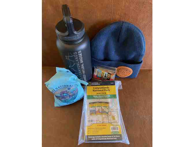 This is a bundle of wonderful items for anyone who loves our local National Parks! Bundle includes a heavy duty water bottle, a blue Arches beanie, and a tote bag, all with NP logos, as well as a set of three maps for Canyonlands (one for each district) and a Moab magnet.