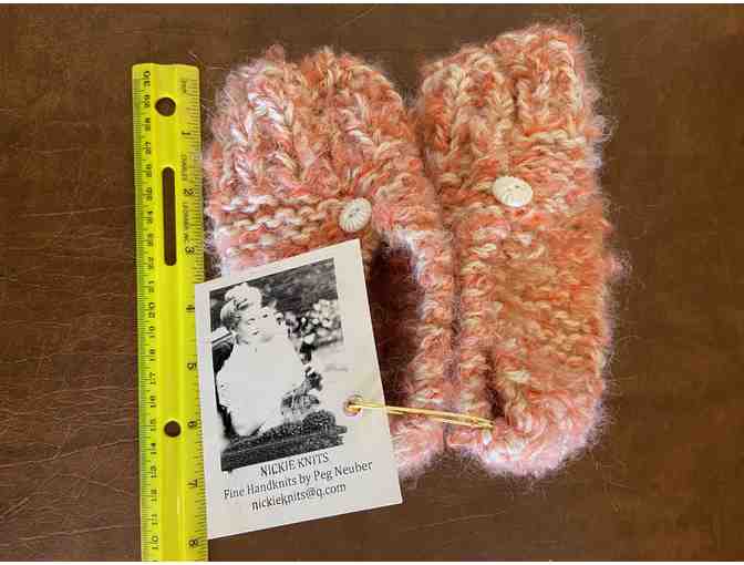 With these slippers on your child's feet, their toes will be toasty all year round! Treated on the bottom to prevent slipping. Hand knitted by Peg Neuber of Nickie Knits!
