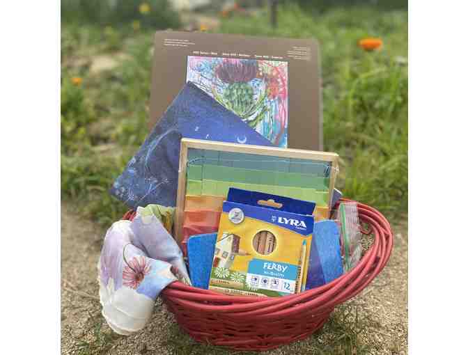 A basket filled with high-quality art and creativity supplies, donated by our second-grade class.