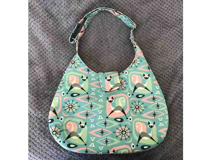 This is an adorable teal/mint/pink cat themed bag with snap closure and shoulder straps. Pink inside with two pocketed areas. Aprox 11" tall without straps and 14" wide. Very nice!