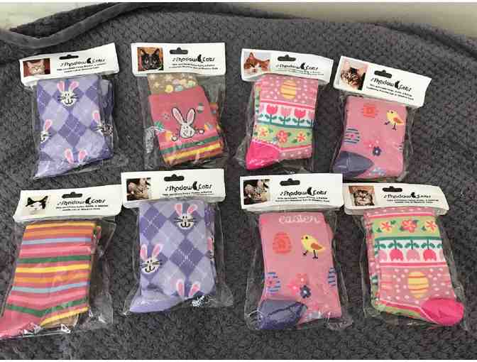 We will pick one of these adorable sets of Easter knee high socks for you. Each set of socks is packaged up so that the receiver can see a little about the organization they are helping and a picture of one of our kitties. Great for gifting. Approx womens size 7 - 11