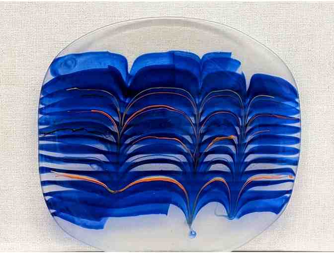 Large handmade 14 1/2" x 13 3/4" glass tray. Clear background with blue, orange, and yellow detail.