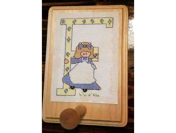Hand cross-stitched letter F, affixed to wooden board with peg. Can be hung for a child's coat hook or backpack. Measures 5 inches wide, 7 inches high. Will need a hook or bracket to be attached to back for hanging.