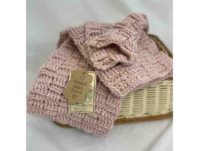 Enjoy this hand knitted basketweave scarf in beautiful rose-colored acrylic yarn.