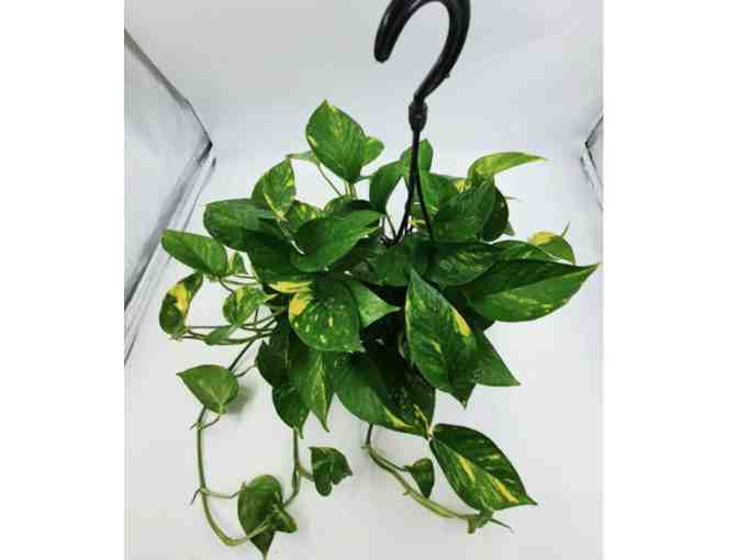 Large Beautiful Gold and Green Marbled Pothos Plant, is currently in a hanging pot, but can be easily transferred.