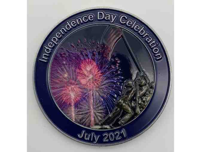 This coin honors those that worked the 2021 Independence Day Celebrations. The coin measures just over 2" in diameter.