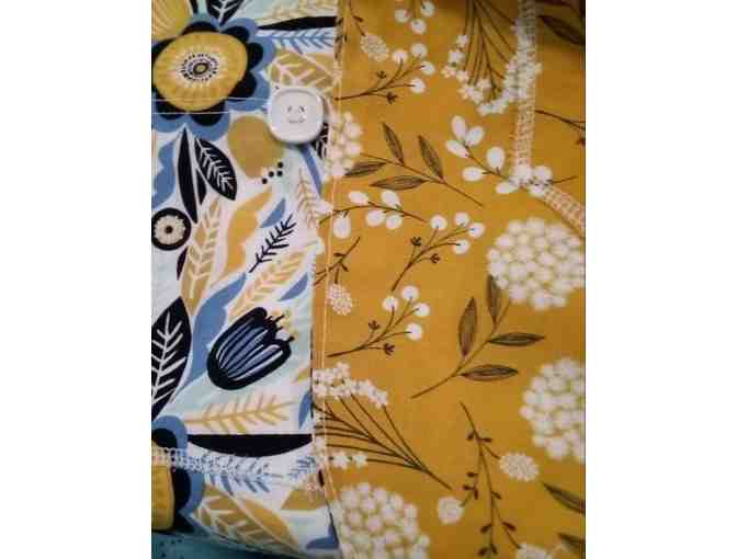 100% cotton. Inspired by my mom and friend at a senior center. Long enough to cover the lap, pocket for tissues, and velcro closure at the neck. Machine Wash cold, line, or light dry. This is REVERSIBLE, one side Blue flowers the other side White flowers. PLEASE VIEW ALL 2 PHOTOS. This clothing protector will be a conversation piece for sure. ONE SIZE