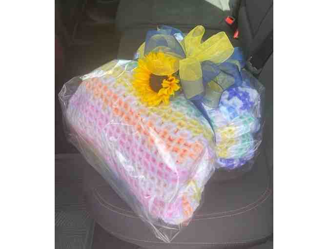 Crocheted afghan measures 57”x57”. Handmade from acrylic yarns.