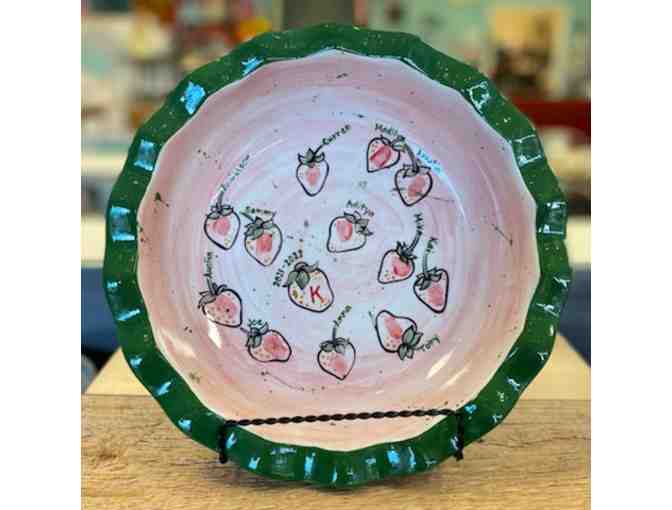 Enjoy the beautiful pie dish with hand-painted fingerprints from the Kindergarten Red Group. This is a wonderful keepsake!