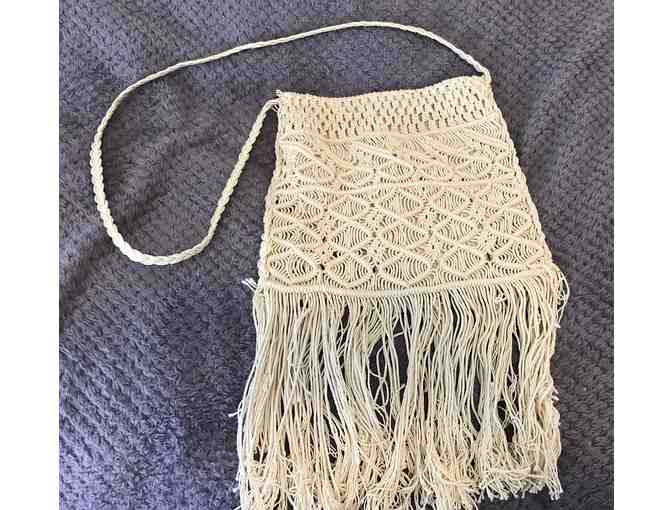 This lovely purse features an off-white macrame exterior, braided shoulder strap and 7 inch fringe lines the bottom. Great for a beach day or summer accessory. Inside has stick on velcro closure which in our opinion isn't the best. A simple button addition would provide more sturdy closure. No inside pockets.