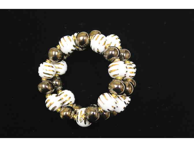 This coiled bead bracelet is handmade in Kenya. It will fit any wrist comfortably due to the expandable coils. This bracelet features gold highlights on the beads. The Kazuri Company only hires single mothers and pays them a livable wage with benefits, which is not so common in Africa. The women form the beads from river clay, paint, fire, glaze and string the beads into necklaces, earrings and bracelets.
