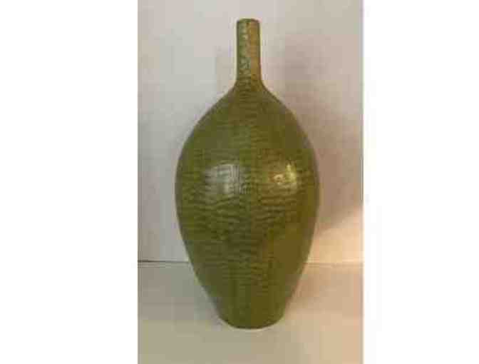 This vintage mid-century green ceramic vase stands 21" tall and is approximately 9.5" in diameter. There is no signature or stamp on the bottom.