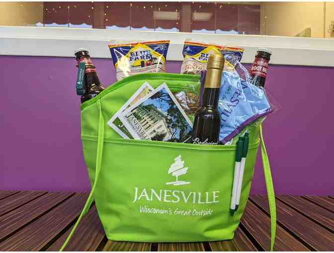 Fun cooler bag, stuffed with two bottles of soda from Gray Brewing Company, two bags of Blue Farm Corn Chips, Timberhill Winery wine, Truffles from the Sugar Exchange, bottle of infused olive oil from the Bodacious Olive, plus two Janesville postcards, two pens, two masks, and a bottle opener key ring. Choose from three different olive oils.