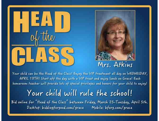 Start the day with VIP treats in the Teachers Workroom, Special Introductions as our Classroom Leaders in Chapel, enjoy lunch on Grace, and partake in special afternoon snacks! Each homeroom teacher will provide lots of special privileges and honors for your child to enjoy!