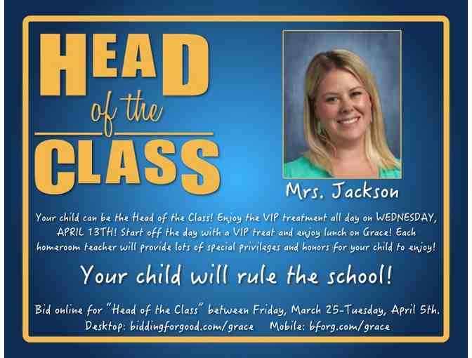 Start the day with VIP treats in the Teachers Workroom, Special Introductions as our Classroom Leaders in Chapel, enjoy lunch on Grace, and partake in special afternoon snacks! Each homeroom teacher will provide lots of special privileges and honors for your child to enjoy!