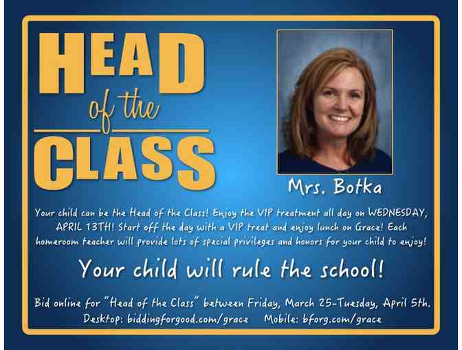 Start the day with VIP treats in the Teachers Workroom, Special Introductions as our Classroom Leaders in Chapel, enjoy lunch on Grace, and partake in special afternoon snacks! Each homeroom teacher will provide lots of special privileges and honors for your child to enjoy!