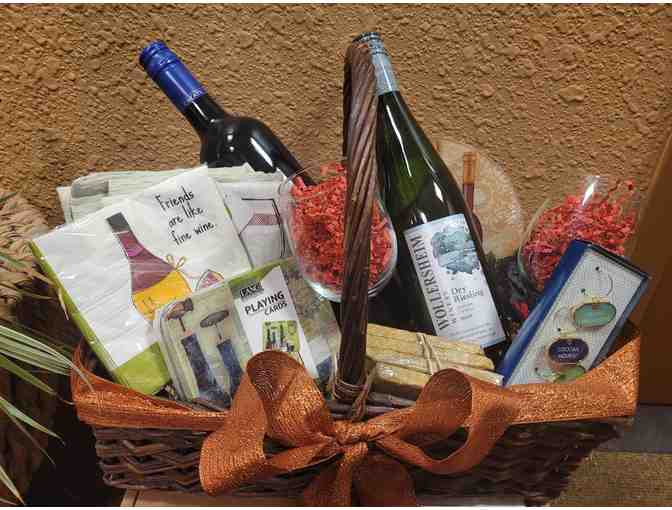 Includes : 2 bottles of wine, 2 glasses, Wine glass identifier rings, Wine themed coasters, playing cards, kitchen towels, cutting board, party plates and napkins, appetizer cook book