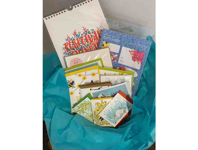 This basket is full of fun birthday cards, note cards, notepads, labels, and a calendar. All hand made in Acton!