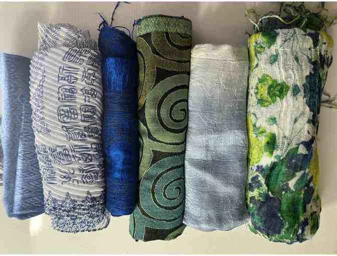 Six beautiful scarves - wool, linen, and silk - in hues of blue and green