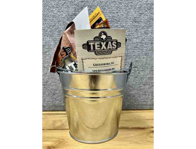 A gift certificate for dinner for 2, three gift certificates ($15) for entrees, and a gift bucket of Texas Roadhouse items (peanuts, grilling sauce)