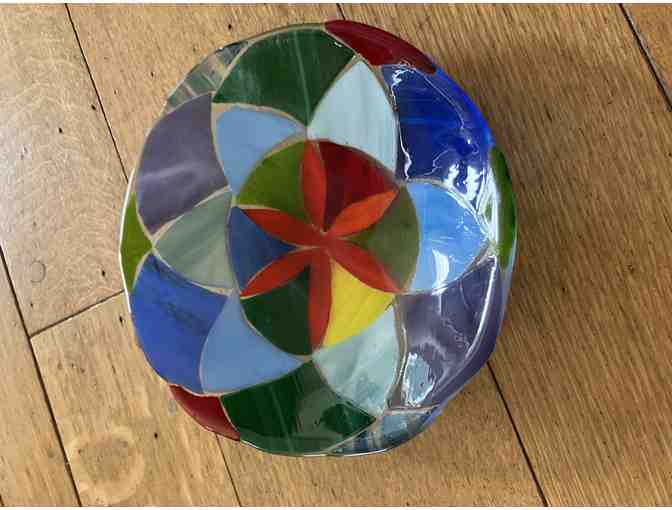 This brightly colored bowl, 9.5" in diameter, was made by Rocio Smith, Bay Area activist and artist.  This multi-colored, one-of-a-kind bowl will add cheer and beauty to it's future owner's home.