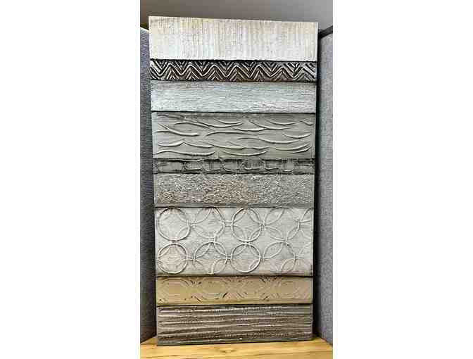 Textured silver toned framed canvas artwork. Can be hung vertically or horizontally