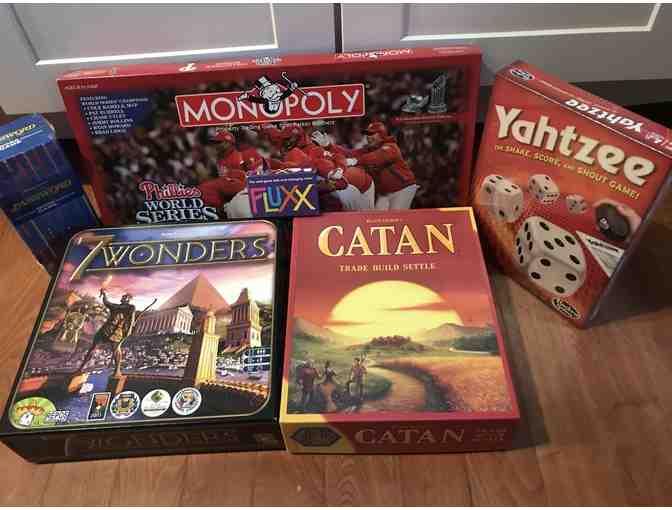 Old and new board games for your enjoyment: Never opened classics Yahtzee and Password. Never used Collectors edition of Monopoly celebrating the 2008 Phillies World Series, Popular new games of Cataan (unopened), Fluxx (like new) and 7 Wonders (used once).