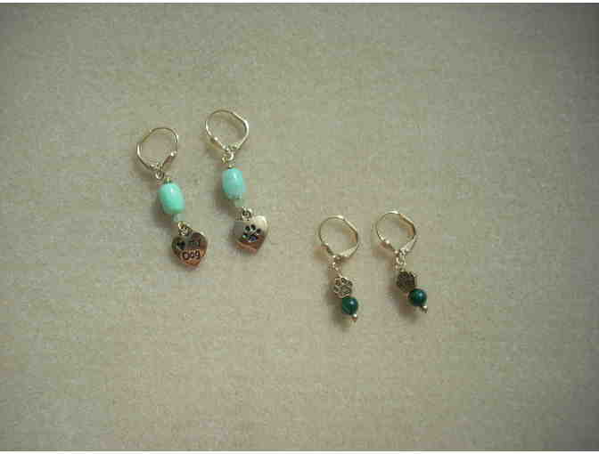 The first set of earrings contain a chrysoprase tube bead and a gold heart. The second pair have a dog paw with a Malachite round bead. Both pairs have hypoallergenic lever-backs.
