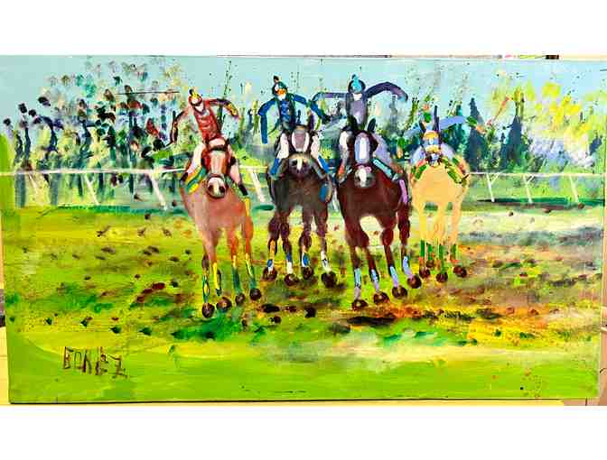 Large oil painting (36"x48") of jockeys racing horses (our Preakness theme picture)