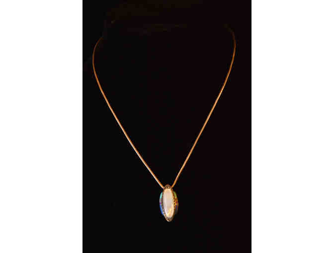 Sterling silver snake chain necklace with a lobster clasp with an oval pendant containing multiple semiprecious stones – main stone milky white thought to be moonstone/hecatolite, then turquoise, milky white, violet and royal blue (perhaps lapis) on each side.