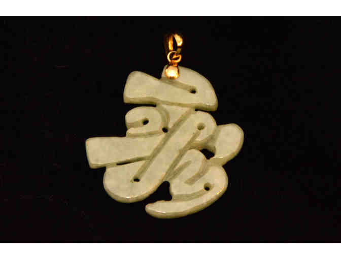 This lovely green jade pendant with its 14K yellow gold bale has been hand crafted by artisans into the Chinese character for “long life.” The symbol itself is an important motif in Oriental jewelry, art and even daily life. Jade is an enduring treasure to be worn and enjoyed, and whether given as a gift or bought for yourself, the Chinese believe that jade brings good luck and good fortune to those who wear it.