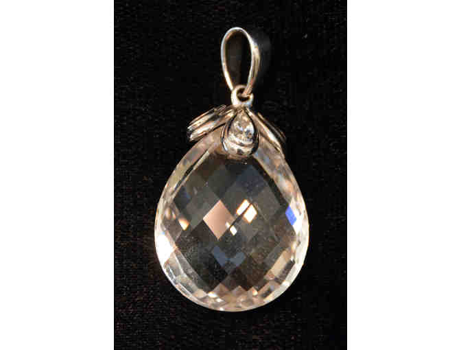 This many-faceted clear crystal catches the light beautifully and is sure to be eye-catching with any outfit. The bell cap to attach the bale is sterling silver and features three additional small crystals, one in the front and two on the sides.