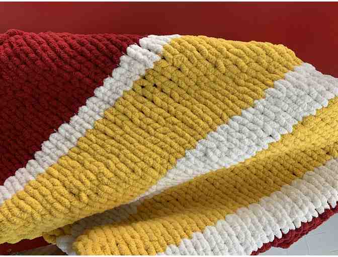 Handmade blanket by Kristen Smith made in the Christopher Academy colors. Great for two people as a stadium blanket or to cuddle up on the couch.