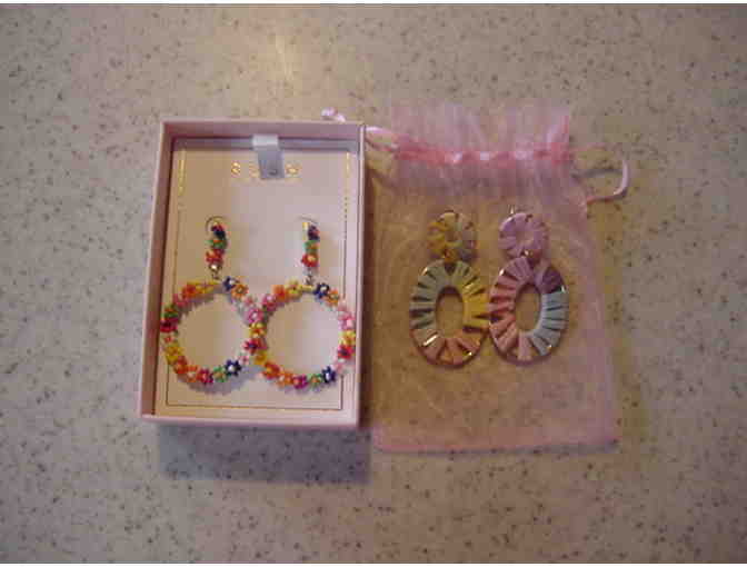 1 pair post flower earrings - Rush by Denis & Charles. Approx diameter 1-3/4". 1 pair post oval ribbon wrapped. Approx 1-1/2" wide x 1-3/4" long.