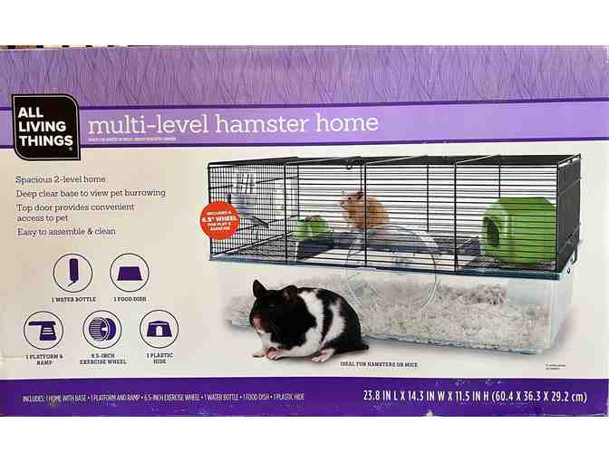 Includes: 1 water bottle, food dish, platform 7 inch ramp, 6.5 inch exercise wheel, and 1 plastic hide (23.8Lx14.3Wx11.5H)