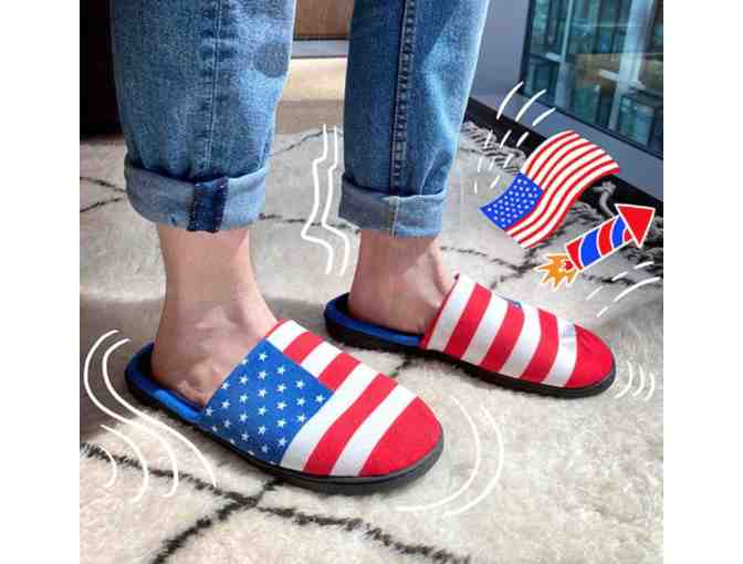 Show your love for the Land of the Free with Coddies American Flag Slippers size Men's 10.5 - 12. These bold, bright beauties are so patriotic it’s a wonder they’re not the official footwear for Presidents.