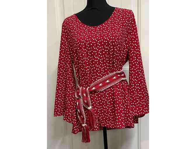 Red blouse (XL). New, never worn. Tiny white hearts scattered all over. 3/4 length loose "bell" sleeves and scoop front neckline.