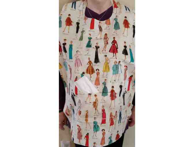 100% cotton. Inspired by my mom and friend at a senior center. Long enough to cover the lap, pocket for tissues, and velcro closure at the neck. Machine Wash cold, line, or light dry. This is REVERSIBLE, one side 1950's other 1960's patterns. PLEASE VIEW both PHOTOS. This clothing protector will be a conversation piece for sure. ONE SIZE Helps to prevent clothing from staining. Not Waterproof.