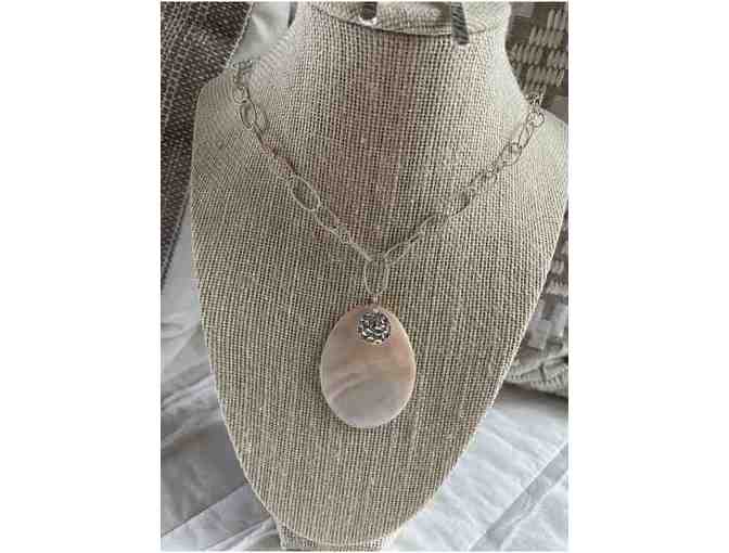 A silver plated necklace with an oval shaped mother of pearl pendant. Silver plated earrings with small, wrapped freshwater pearls. Items made by me in my studio.