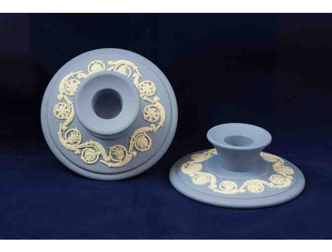 Add an elegant touch to your dinner table with these low profile candle holders, in light blue jasperware with white decorations. The holders measure 1 1/2" high and 3 1/2" at the base. Made in England and stamped Wedgwood, the holders are in excellent vintage condition, resting in the original packaging.