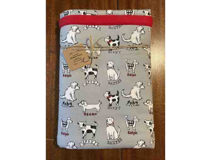 This handcrafted EBP dog blanket features a fun flannel print on the front with a solid color fleece back. Measuring approximately 40"x44".