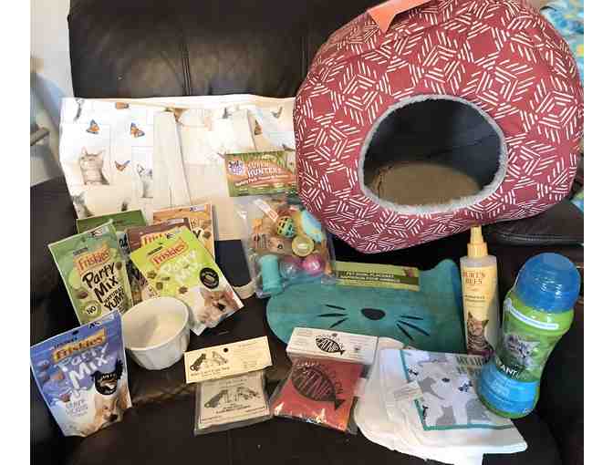 A cat print canvas tote made in Maine, filled with treats, toys, and other things for your kitty. The cat bed pops up to make a tent. This is the purrrfect thing for the cat lover in your life.