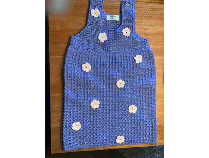 Crocheted dress in cotton. Small toddler size. Sweet flowers added on front and back. Buttons at the shoulders. Machine wash, flat to dry.