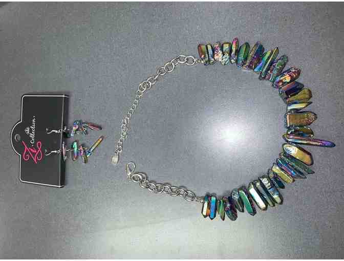 An oil spill iridescence, rawcut pieces of hematite are threaded along an invisible wire below the collar. Has an adjustable clasp closure. Includes matching earrings.