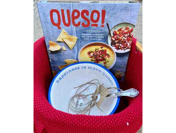 Cute Queso bowl and spoon with recipe book and cute basket for chips