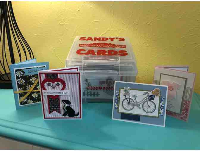 The box will be personalized with YOUR name and color scheme. Box of 60 hand stamped cards with envelopes! The cards include something for evry occasion: Thank you, birthday, get well, baby, just a note.