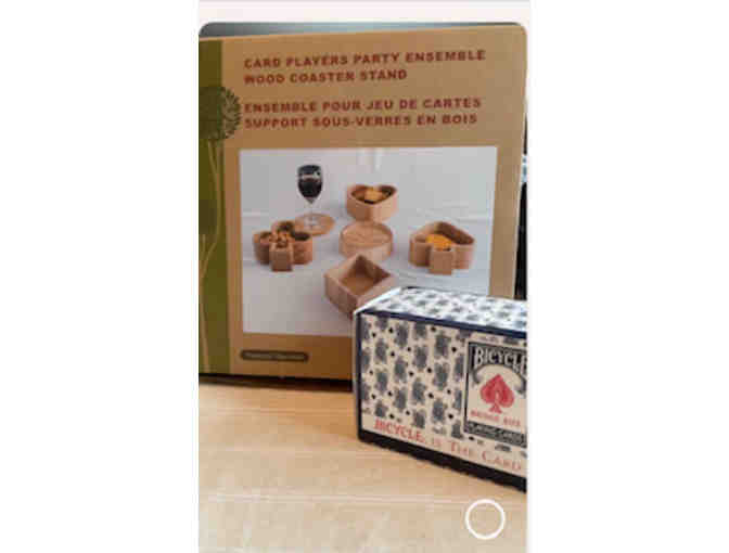 This includes coasters and boxes for snacks. Also includes a new pack of bridge size playing cards.